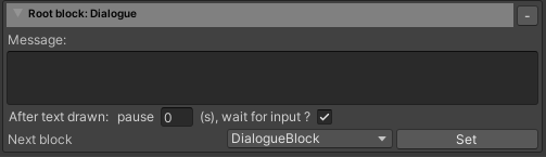 The Dialogue Block allows us to display a text message and control its behaviour (how much should we wait after the text finished and if we should await input after that).